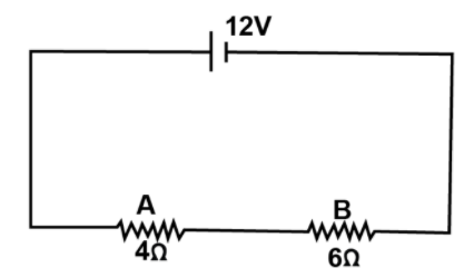 A battery of emf 12V and internal resistance 2Ω is connected with two resistors A and B of resistance 4Ω and 6Ω respectively joined in series. Find: