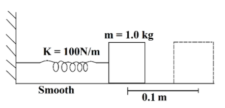 A block of mass m = 1kg is placed on a smooth surface and is connected with a spring of constant K = 100N/m and another end of spring is connected to a fixed wall as shown. The block is pulled by a distance A = 0.10 m from its natural length and released at t = 0