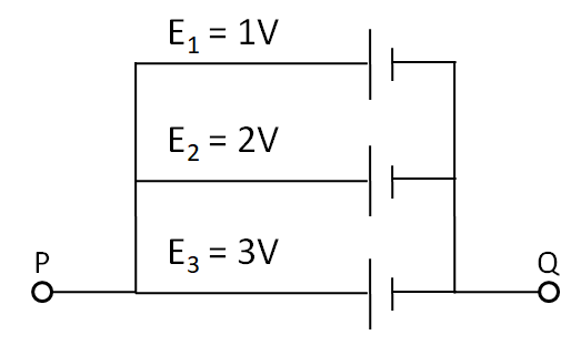 To solve this question, we need to use the formula for the equivalent emf of the batteries connected in parallel combination with each other. The batteries are connected in parallel combination across the point P and Q. Therefore the potential difference between the points P and Q will be equal to the equivalent emf of the batteries.