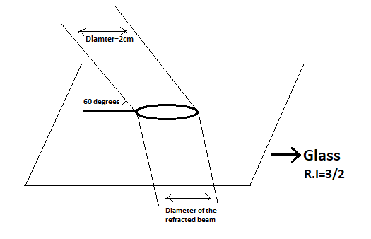We are given a circular beam of light of diameter d=2cm falls on a plane surface of glass and the angle of incidence is 60∘ and refractive index of glass is μ=23