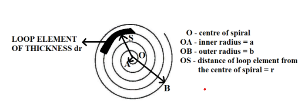For this, let us consider a small loop element of thickness dr, at a distance r, from the centre of the spiral, as shown in the following figure.