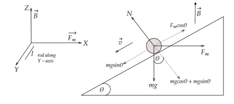 Apply the Fleming’s Left-hand rule, the magnetic force Fm will be in positive X-axis direction.The gravity mg will act on the rod vertically downward i.e., negative Z-axis.Now resolving both mg and Fm into different components. The normal force N acting on the body will be balanced by the mgcosθ+Fmsinθ. Since the rod is moving with constant velocity, the net force acting on the rod must be zero. So, we got