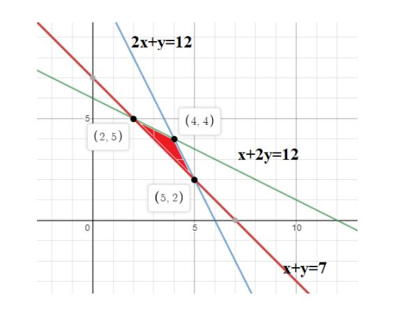 In the above figure, the red shaded region is the feasible region with three corner points. (4,4), (2,5), (5,2)