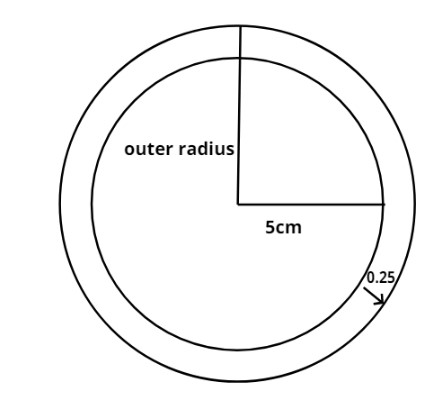 ⇒Outer radius = 5cm + 0.25cm = 5.25 cm