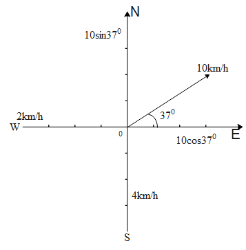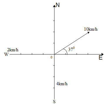 A motorboat is observed to travel 10kmh−1 relative to the earth in the direction 37∘ north of east. If the velocity of the boat due to the wind only is 2kmh−1 westward and that due to the current only is 4kmh−1 southward, what is the magnitude and direction of the velocity of the boat due to its own power?