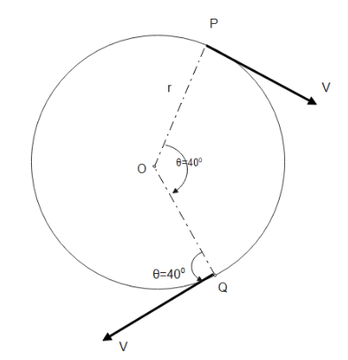 A particle is moving on a circular path of radius R with uniform speed we. The magnitude of change in velocity when the particle moves from P to Q is:- (∠PPOQ=40∘)