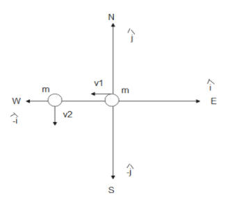 Moreover, we have been given that particle 1 of mass m is moving towards the west. Let us take the velocity of this particle to be v1.