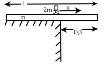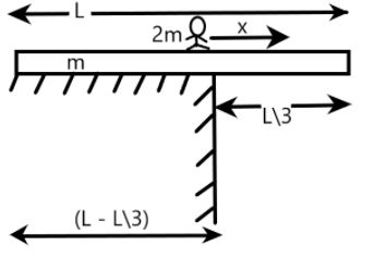 We are given a plank of mass m and length L, placed on a table such that 3L of its length is out of the table, as shown in the following figure. A person of mass 2m is standing on the plank such that his position is at the edge of the table. We are required to find the distance on the plank which the person can move such that the plank does not fall.