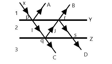 We will move ray by ray from the incident ray X to the final ray D. A ray X is incident on surface Y at point P. It splits apart and is transmitted and another reflected. No information was given about the ray A, so no conclusion can be deduced from this alone. Now, the transmitted ray I, in medium 2, splits again at point q into a transmitted ray C and a reflected ray J. There can be no phase change in ray C since it is a transmitted ray. The reflected ray from point q (ray J) splits into a transmitted ray B and a reflected ray D. According to the question, ray B and D undergo a phase change of π. According to the concept, no phase change can occur for ray B (because it’s a transmitted ray) at point R, thus ray J must have a phase change of π. Since ray I has no phase change (because it’s a transmitted ray), ray J must have undergone phase change at point q. From the concept, medium 3 must therefore be denser than medium 2 which implies that μ3>μ2. Now, part of the phase-changed ray J was reflected as ray D. However, ray D also has a phase change of π (with respect to the first incident ray X) which means that no other phase change occurred at point r. This happens if medium 1 is less dense than medium 2. Therefore, μ2>μ1.