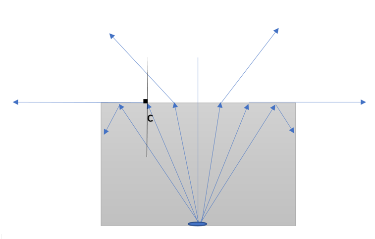 In the above figure shown, the slab is placed inside water and a source of light is placed at the bottom of the slab which emits radiation in all directions. For the medium, we are given n2=1.33 (in which rays are going) and n1=1.5 (from which rays are coming). The critical angle is shown in the figure by ‘c’.