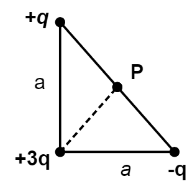 A right isosceles triangle of side a has charges q,+3q and −q arranged on its vertices as shown in figure. What is the electric potential at P midway between the line connecting the +q and −q charges?