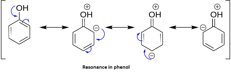 Phenols are more acidic than the saturated alcohols due to the stabilization of the negative charge on the phenolate ion in the benzene ring. For example the phenol group is far more acidic than methanol because the methoxide ion is very unstable whereas the phenolate ion is stable due to resonance. Resonance in phenol: