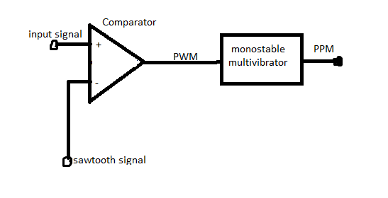 The generated PPM pulses have the same amplitude and width. The below diagram explains the generation of PPM from the PWM signals.