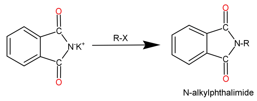 Step 2: Now, the obtained imide ion is treated with alkyl halide (R−X). The electrophilic carbon of the alkyl halide is attacked by the nucleophilic imide. Halogen atom of the alkyl halide is removed and replaced by the nitrogen atom which bonds with the carbon itself. This results in the formation of N-Alkyl Phthalimide.