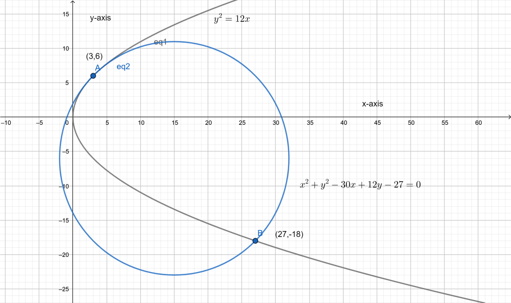 From the question given that we have to prove that, the normal to y2=12x at (3,6) meets the parabola again in (27,−18) and circle on this normal chord as diameter is x2+y2−30x+12y−27=0. As we know that the general equation of a parabola is y2=4ax and the general point is (at2,2at), and the general equation of the normal for this parabola is y+tx=2at+at3.