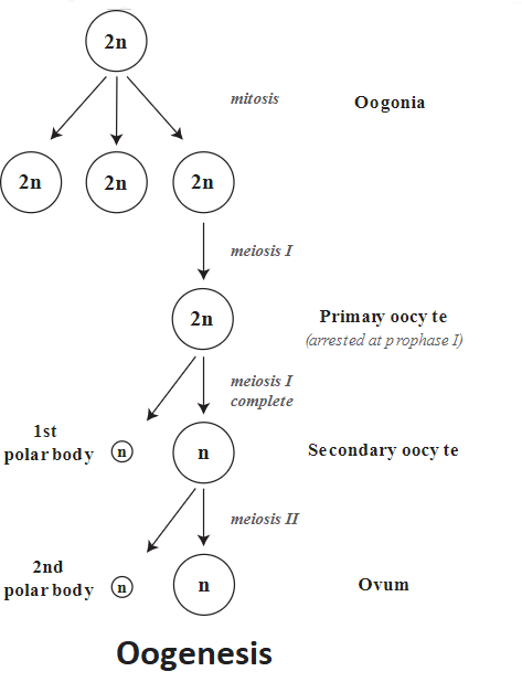 Option B. Oogenesis: Oogenesis is the growth process in which a primary egg cell or ovum in a human female reproductive organ becomes a mature ovum. These cells are called primary ova. They remain dormant until just before the ovulation time when an egg or ovum releases from the ovary. This process doesn’t contain any cell division, it is a simple cell maturity process.