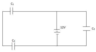 Here in this question, we are given the two capacitors C1 and C2 are connected in series having a potential difference of 12V across them and the third C3 , having potential difference of 12V across it.