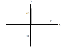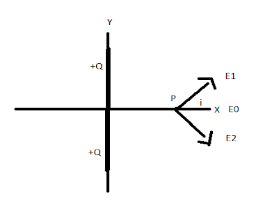 In the given diagram we can see the two point charges +Q on y axis. One positive point charge is on the upper side of the y axis and another positive charge is on the lower side of the y axis. The direction of charge q on the upper axis is along the direction E1 and the direction of charge q on the lower axis is along the direction E2 as shown in the diagram. The total electric field at the point p is along the direction of E0 which is symmetric about the x-axis. The direction of E0 is along the positive x axis, i.e. it is along i→.