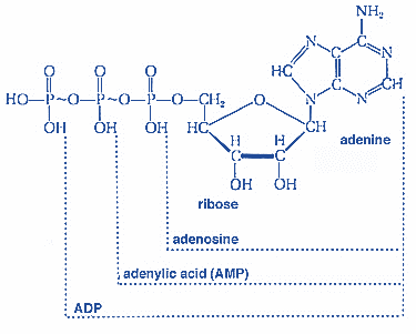 Adenosine Triphosphate, abbreviated as ATP, is an organic compound. It is composed of three phosphate bonds, a sugar called ribose and a base called adenine. The three phosphate bonds are connected to one another by two phosphoanhydride bonds. The bonds are very high energy bonds. ATP is formed when Adenosine Diphosphate reacts with inorganic phosphate in presence of an enzyme ATP Synthase. The formation of ATP takes place in the mitochondria of the cell. ATP can also be formed when Adenosine Monophosphate or AMP reacts with two molecules of inorganic phosphate. ATP, ADP and AMP are constantly working either to make or break phosphate bonds. In this process, energy is either stored or released in a cell.